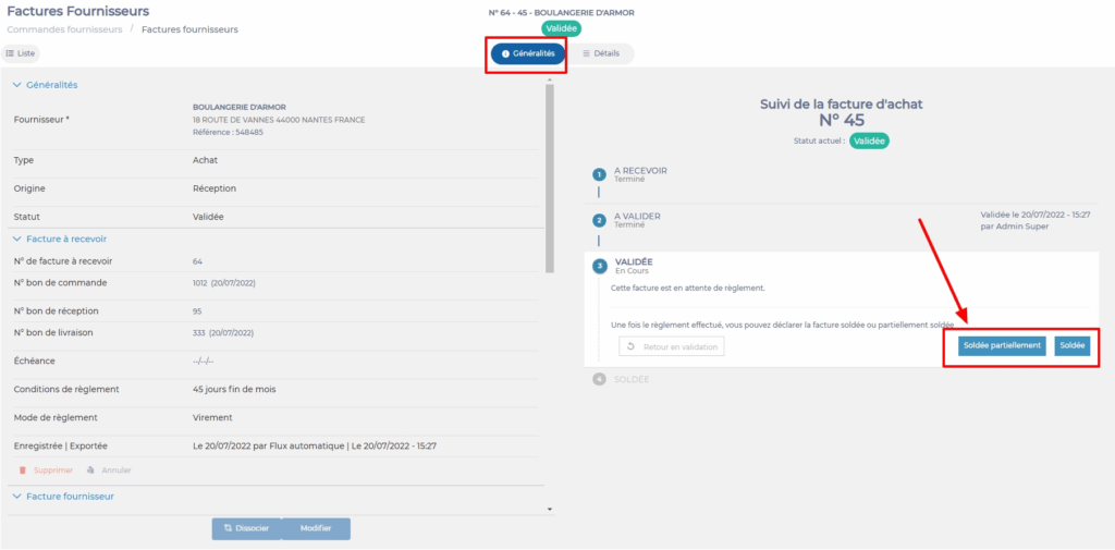 - Dans l'onglet Généralités, cliquez sur le bouton Soldée partiellement ou Soldée.