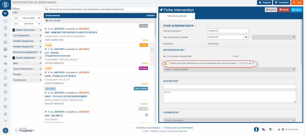 Toutes les demandes d'intervention sont gérées depuis l'écran « Interventions », y compris les interventions de maintenance préventive générées depuis l'écran « Préventif ».