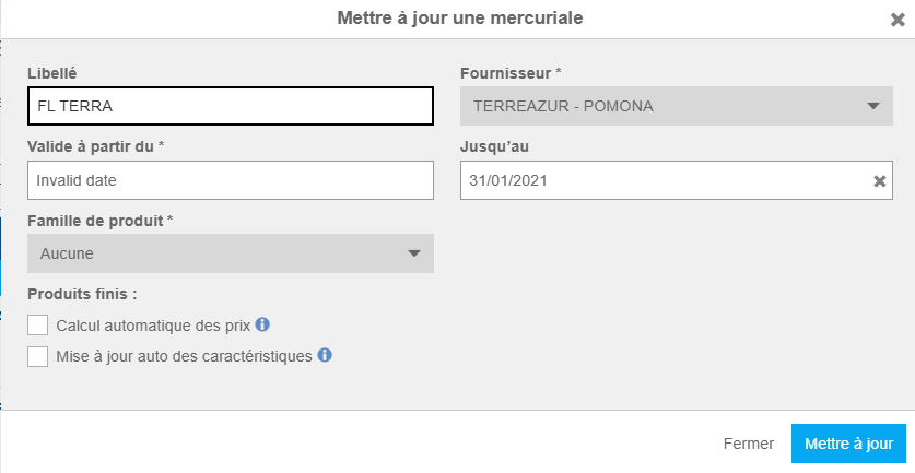 - Valable du … au … : permet d’archiver une mercuriale sans avoir à la supprimer. Une fois la date de fin passée, il n’est plus possible de commander ces produits.