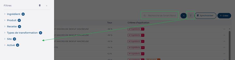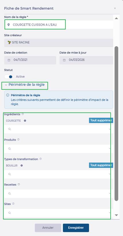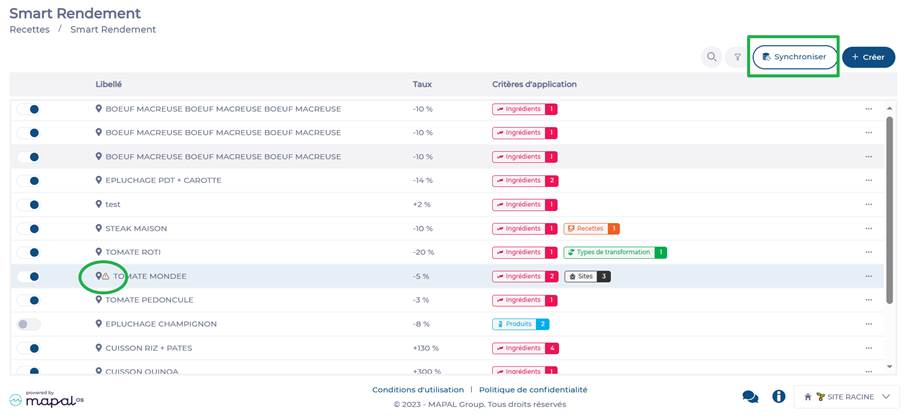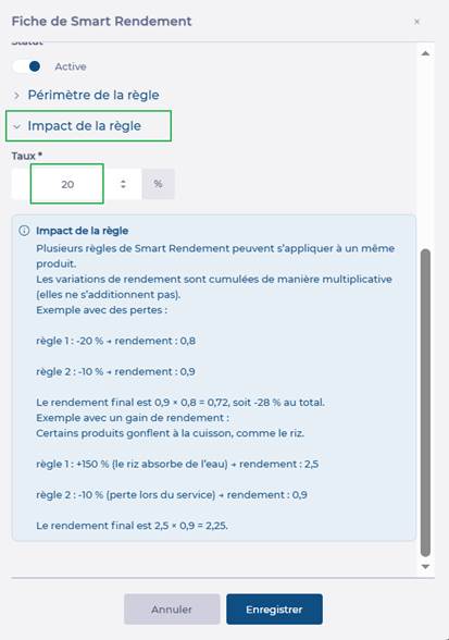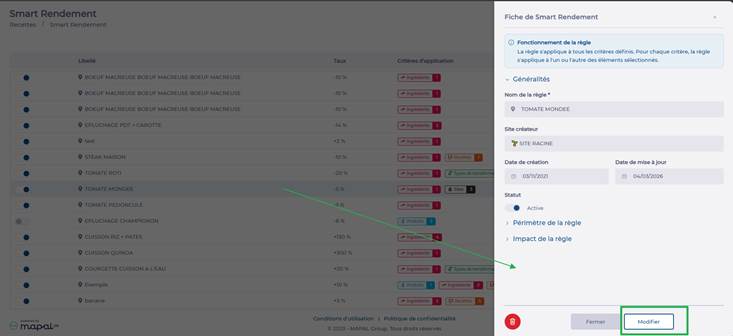 L’écran Smart rendement permet de définir ces différences de façon centralisée, sans avoir à modifier chaque recette et en ayant une vision claire des règles de rendement.