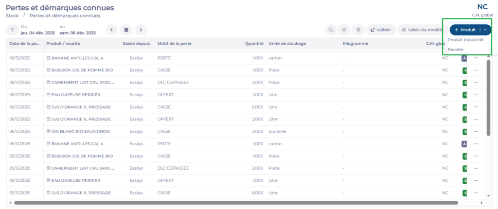Les pertes de produits et de recettes peuvent être saisies depuis cet écran, soit unitairement, soit en utilisant des modèles de pertes. Lorsque vous déclarez une perte de recette, les produits industriels utilisés dans la recette seront déduits du stock lors de la validation manuelle ou du déstockage automatique de nuit suivant votre paramétrage.