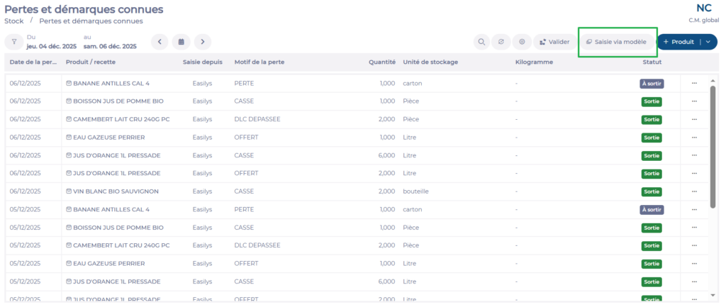 Pour revenir à l'écran répertoriant toutes les pertes, sélectionnez Retour. Les pertes saisies via les modèles apparaîtront avec le statut « À Sortir ». Les produits correspondants seront déstockés durant la nuit ou par la validation manuelle (voir point 3).