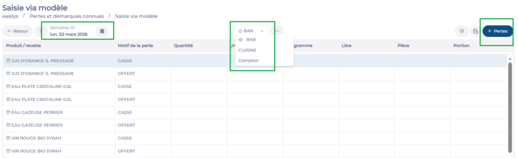 Pour utiliser les modèles, vous devez avoir déjà créé des modèles de pertes. Si ce n'est pas le cas, consultez l'article Créer et gérer les modèles de pertes et démarques connues.