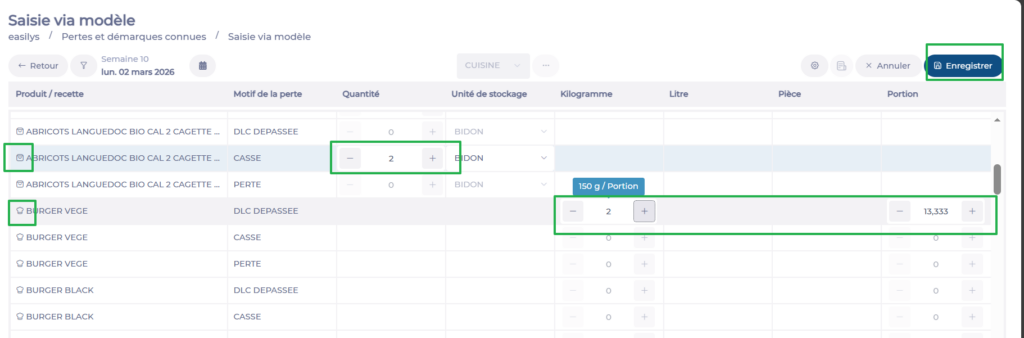 Vous pouvez maintenant saisir les quantités de perte pour chaque élément de la liste, sur la ligne du motif concerné.