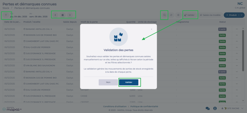 - Votre perte apparaîtra dans la liste avec le statut « À Sortir ». Les produits correspondants seront déstockés durant la nuit ou par la validation manuelle (voir point 3)