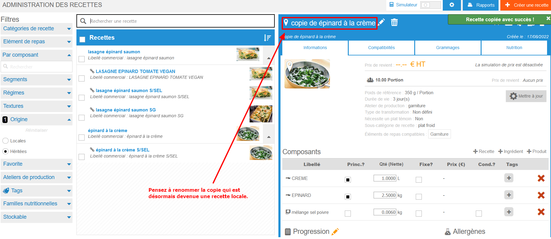 Remarque : Vous avez la possibilité de gérer des déclinaisons de recette ? Plutôt que de dupliquer votre recette pour en avoir une version sans sel ou sans viande, privilégiez la déclinaison de recette. Pour en savoir plus, consulter l'article Décliner une recette pour en avoir différentes versions compatibles avec différents segments, textures et/ou régimes particuliers.