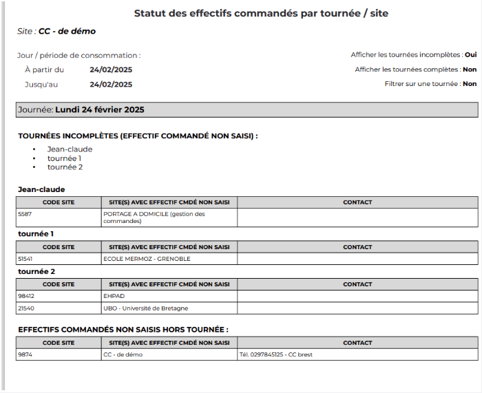 - The report "Status of ordered quantities by tour/site" can be launched from this screen by clicking the report button. It allows you to know, tour by tour, which sites have placed their order and thus have the list of sites and their contact details to follow up with them.