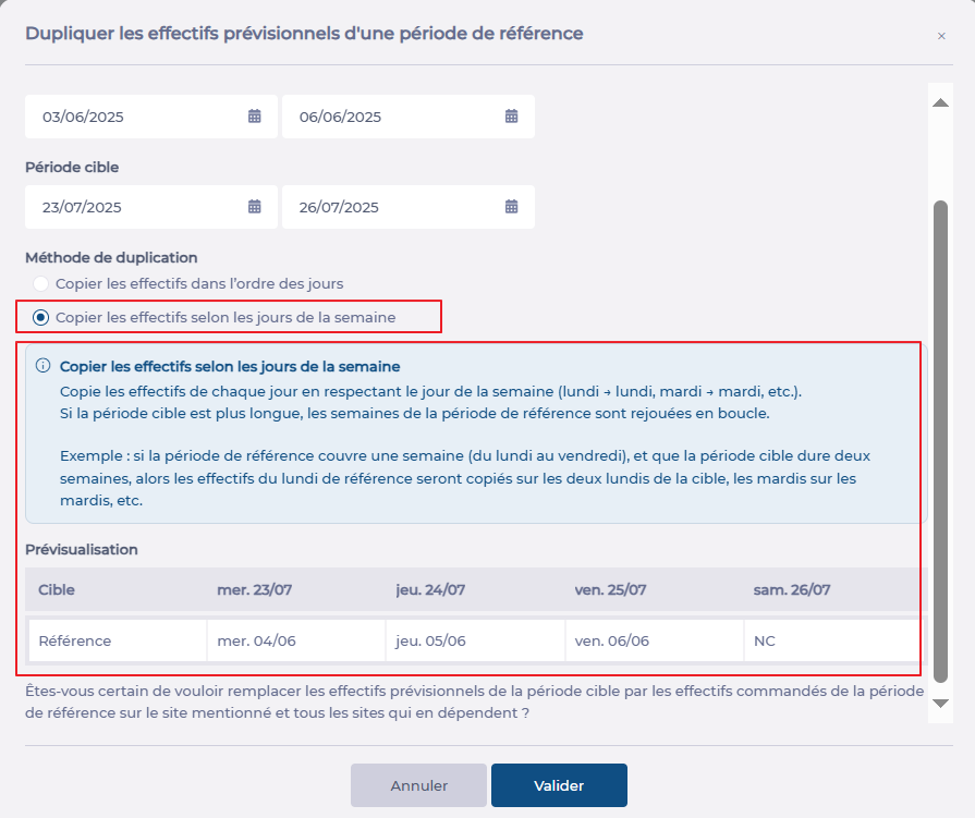 Note: Depending on the chosen period, the available options and the information message will update. Take time to read this message carefully, as well as the summary table that appears if you copy a period longer than one day, so you fully understand the impact of your action.