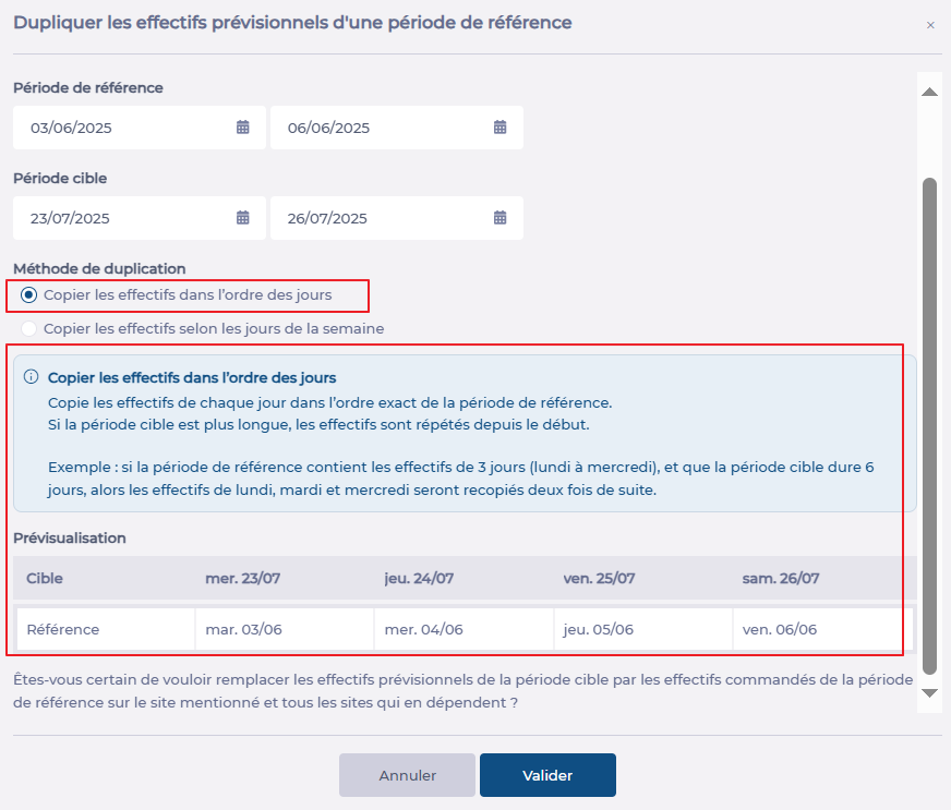 - Message when duplicating a period with the “respect the order of days” option: