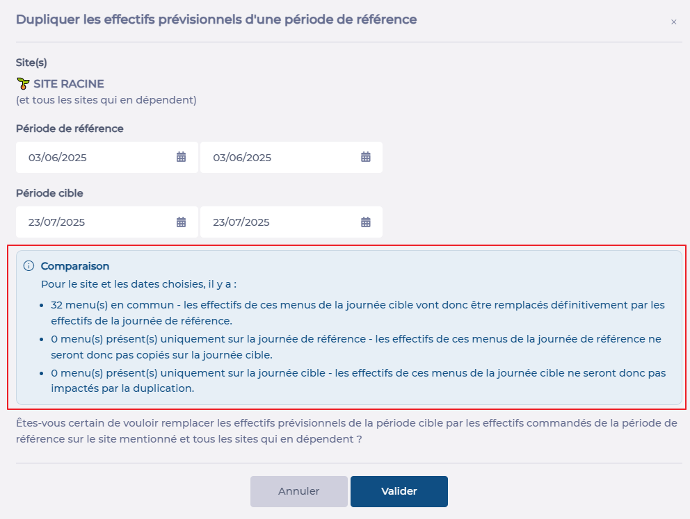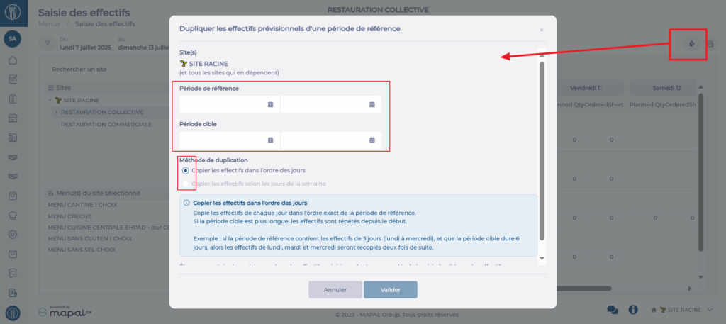 - Message when duplicating a period with the “respect the days of the week” option: