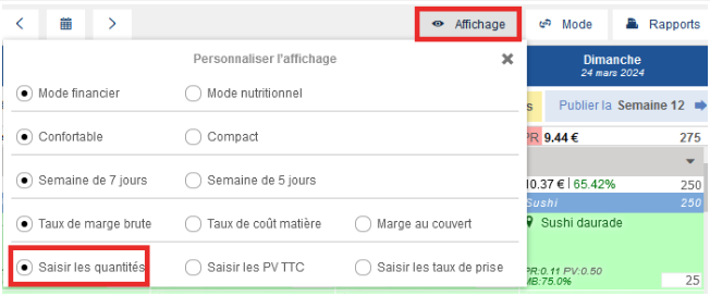 Note: there are several menu display types. You may not be in the view that allows you to enter headcounts. In that case, select Display and choose the option Enter quantities.