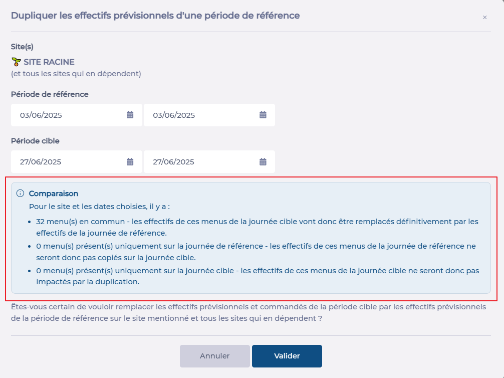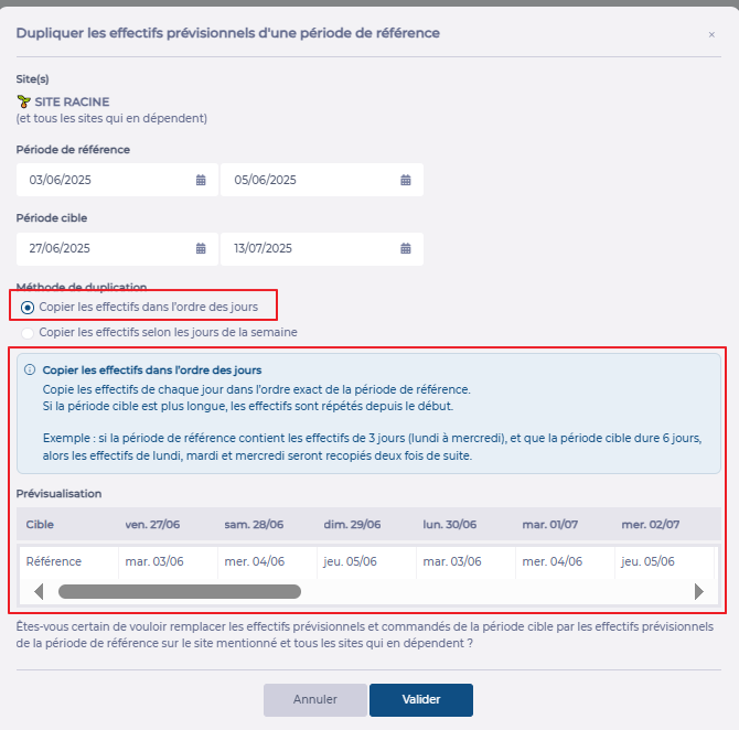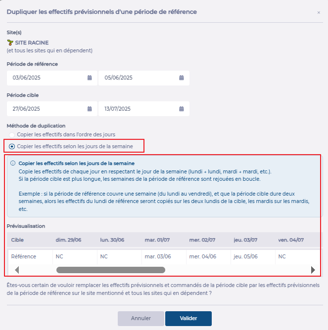 Note: Depending on the selected period, the available options and the information message will update. Take the time to carefully read this message as well as the summary table that appears when copying a period of more than one day to fully understand the impact of your action.