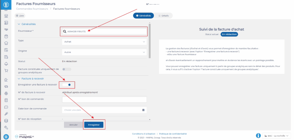 - Enable the "Save an invoice to receive" option in the "Invoice to receive" section. This then allows you to enter the information concerning the ITR (invoice to receive). Without this, you will only enter an SI (supplier invoice).