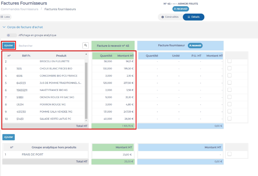 - Go to the "Details" tab of the invoice to add analytical groups outside products and/or the products concerned by the invoice.
