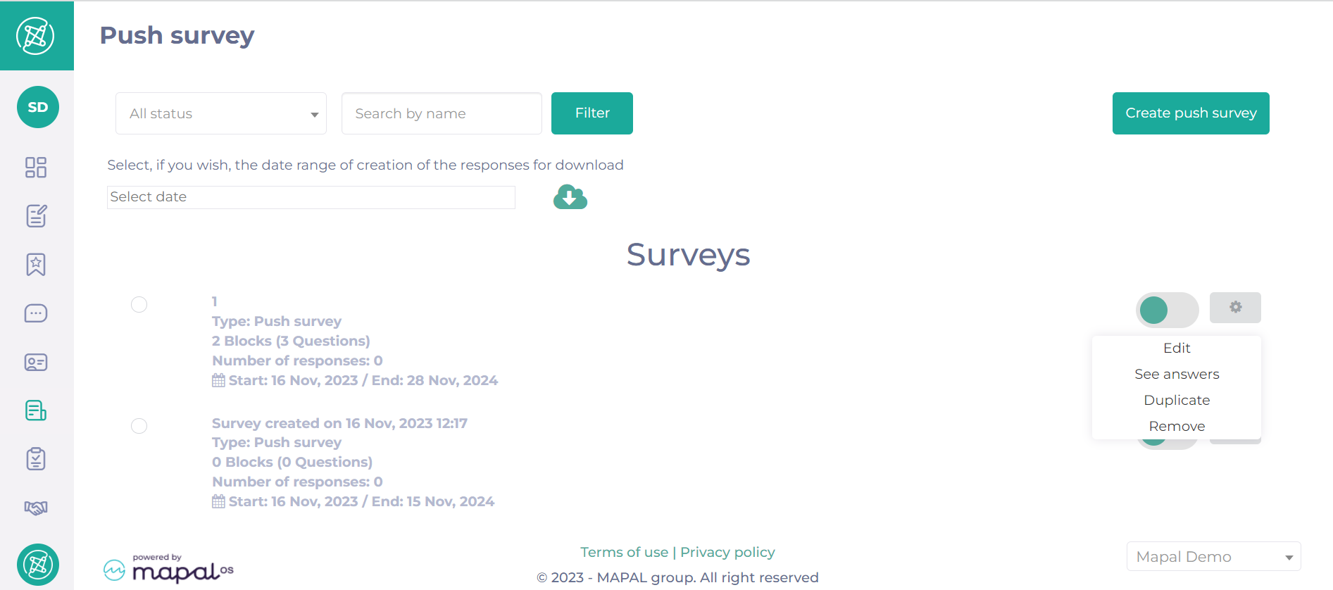 - Sélectionnez l'icône en forme de roue dentée à côté de l'enquête dont vous souhaitez modifier les blocs et les questions.