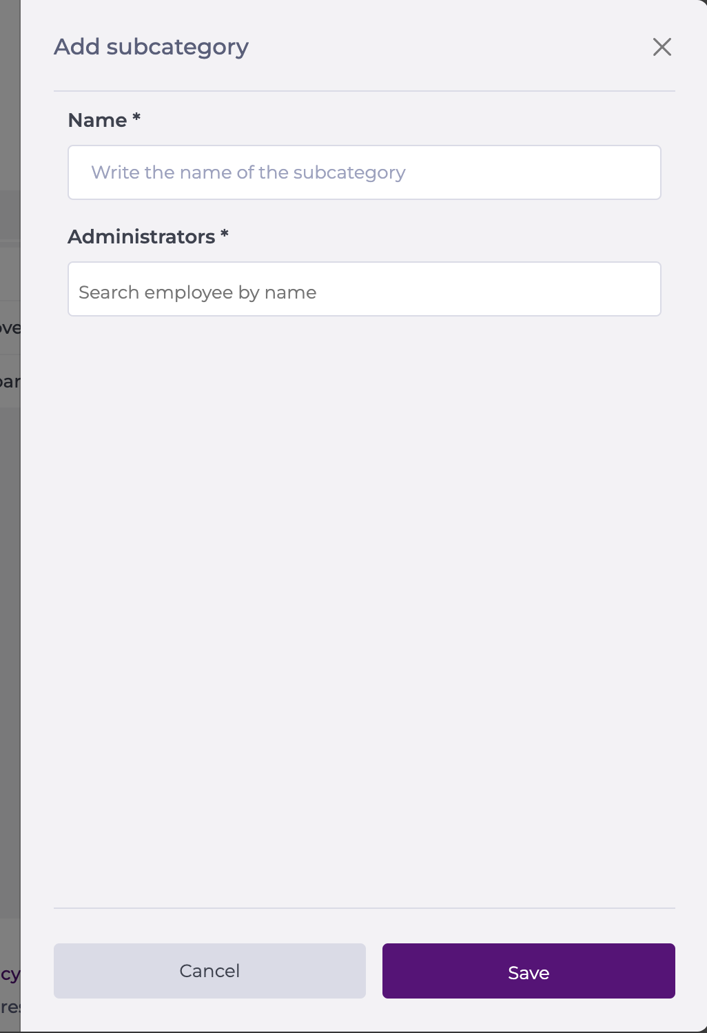 - Sélectionnez un gestionnaire pour gérer cette sous-catégorie dans le champ Ajouter des administrateurs à la sous-catégorie (Add admins to subcategory).