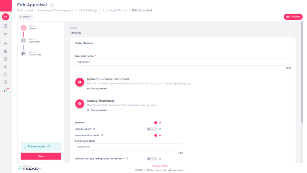 - Sélectionnez Inclure un plan d'action ? dans l'Étape 1 - Détails si vous souhaitez inclure un plan d'action dans votre évaluation.