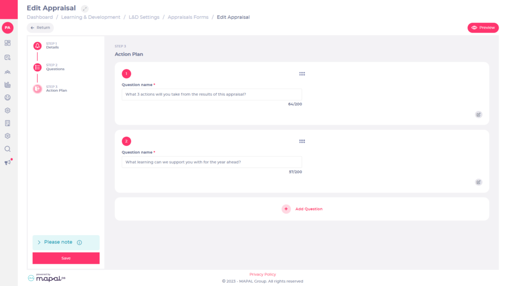 - Sélectionnez Étape 3 - Plan d'action pour commencer à ajouter des questions à votre plan d'action.
