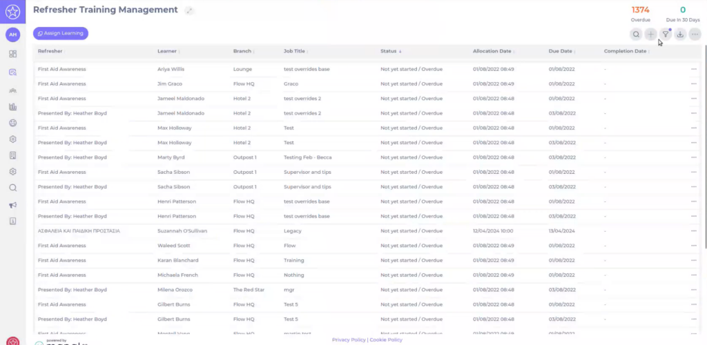 - La grille affiche une ligne par combinaison apprenant / formation de remise à niveau, avec les informations clés suivantes :