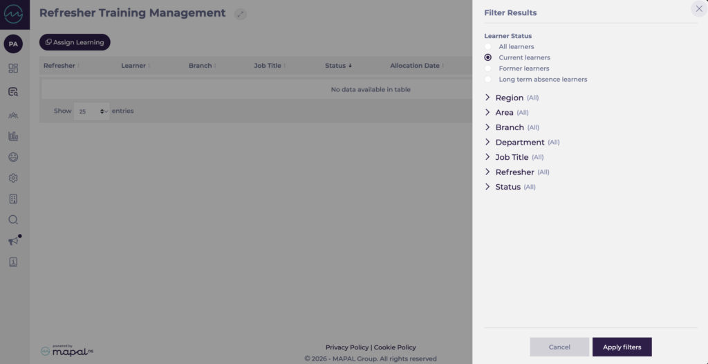 - Sur l’écran Gestion de la formation de remise à niveau, sélectionnez l’icône Filtrer en haut à droite.