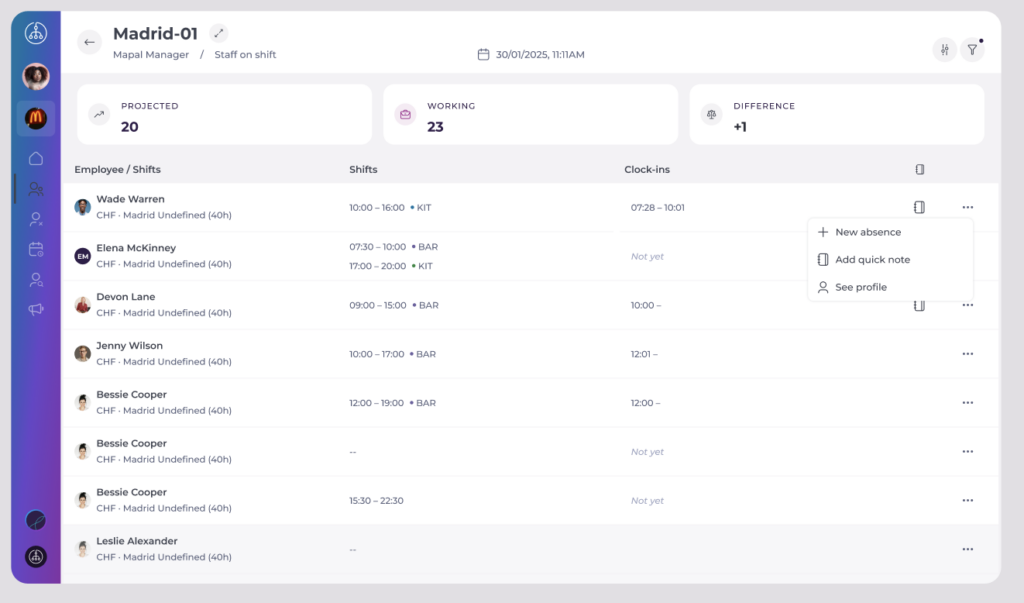 - Accédez à Personnel en poste. Sur cet écran, vous pouvez voir :