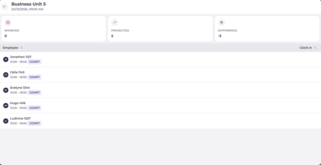 La vue se met à jour automatiquement lorsque les employés pointent leur entrée ou leur sortie.