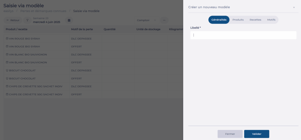 - Using the Products and Recipes tabs, select the products and/or recipes corresponding to the losses you want to be able to declare in this template.