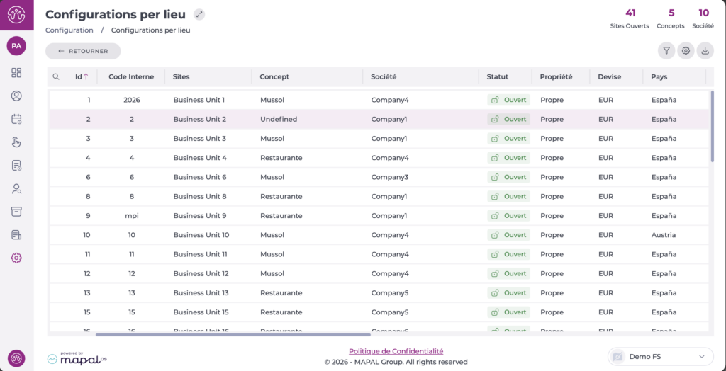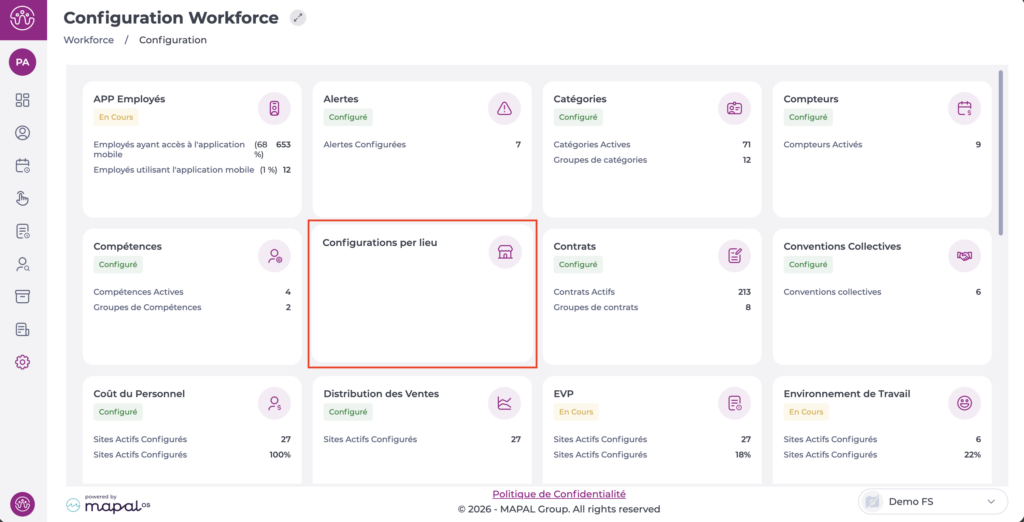 - Depuis le menu principal, accédez à Configuration > Configurations per lieu.