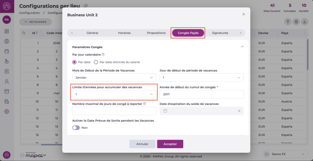 - Localisez le champ Limite d'années pour accumuler des vacances et sélectionnez la valeur correcte, avec un maximum de 4 ans.