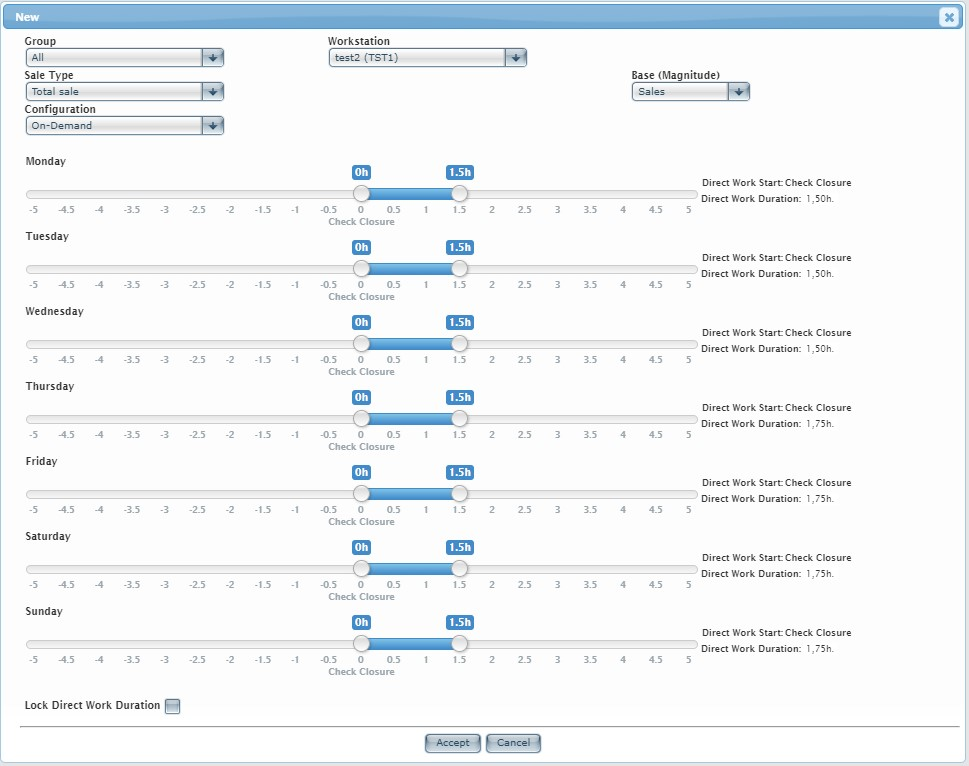 1. Sous demande : À utiliser pour configurer la demande durant les heures d'ouverture. La durée du travail direct définit la durée pendant laquelle un événement (par exemple, un client ou un ticket) a un impact sur un poste de travail. Par exemple, dans un restaurant typique, la durée de travail directe d'un serveur est d'environ une heure et demie, tandis qu'un cuisinier peut terminer une table en une demi-heure. En fonction de l'heure d'ouverture du ticket, la plage horaire peut s'étendre.
