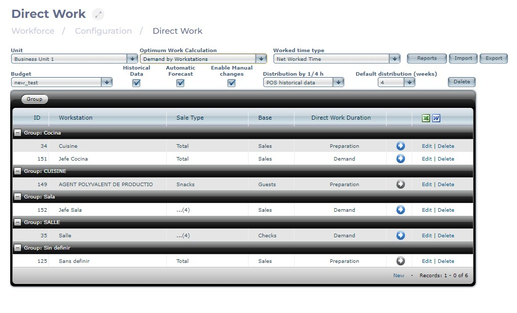 Lorsque vous enregistrez des estimations de travail direct par poste de travail, vous voyez apparaître un écran récapitulatif indiquant le groupe, le type de vente, la base et la durée du travail (ou de la préparation) de chaque poste de travail.