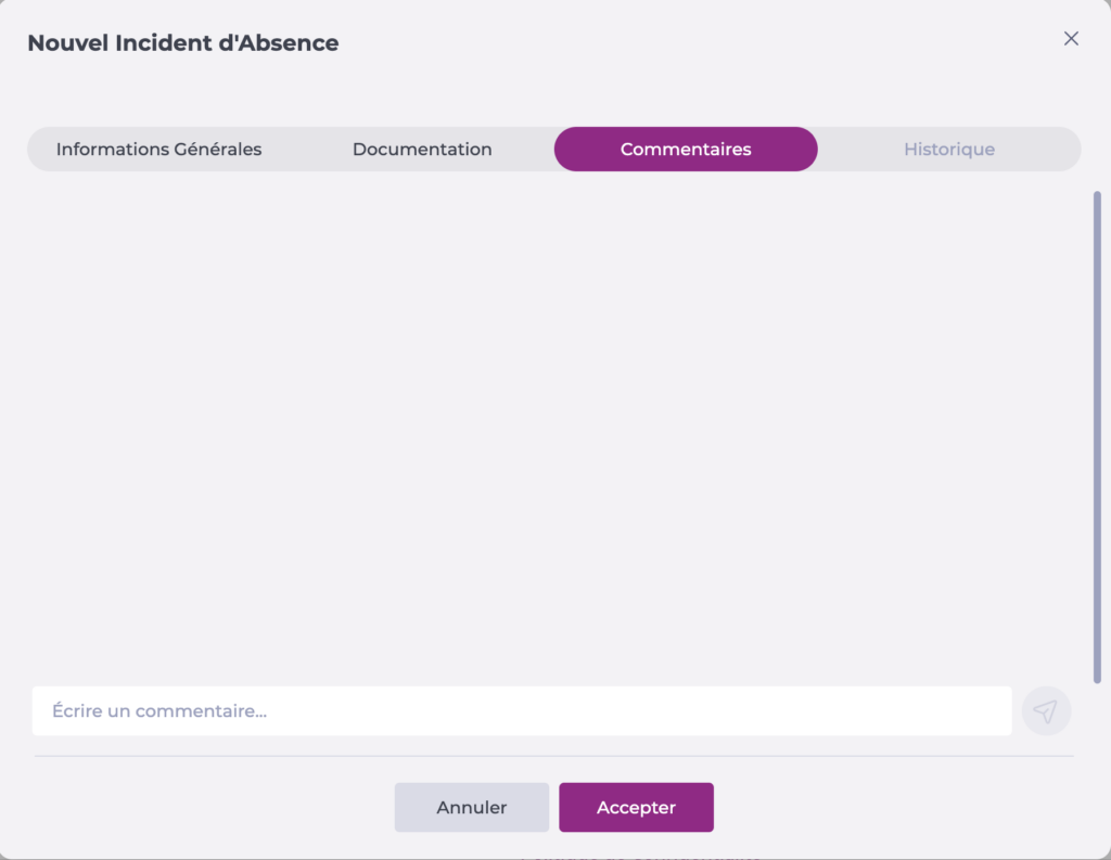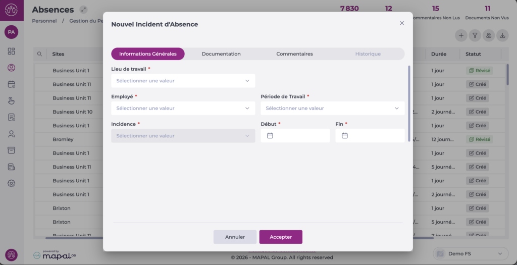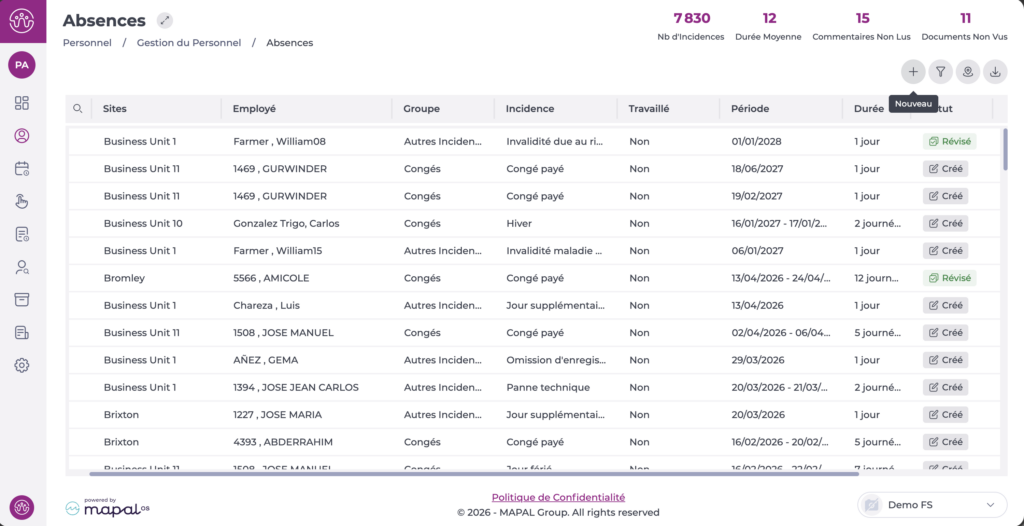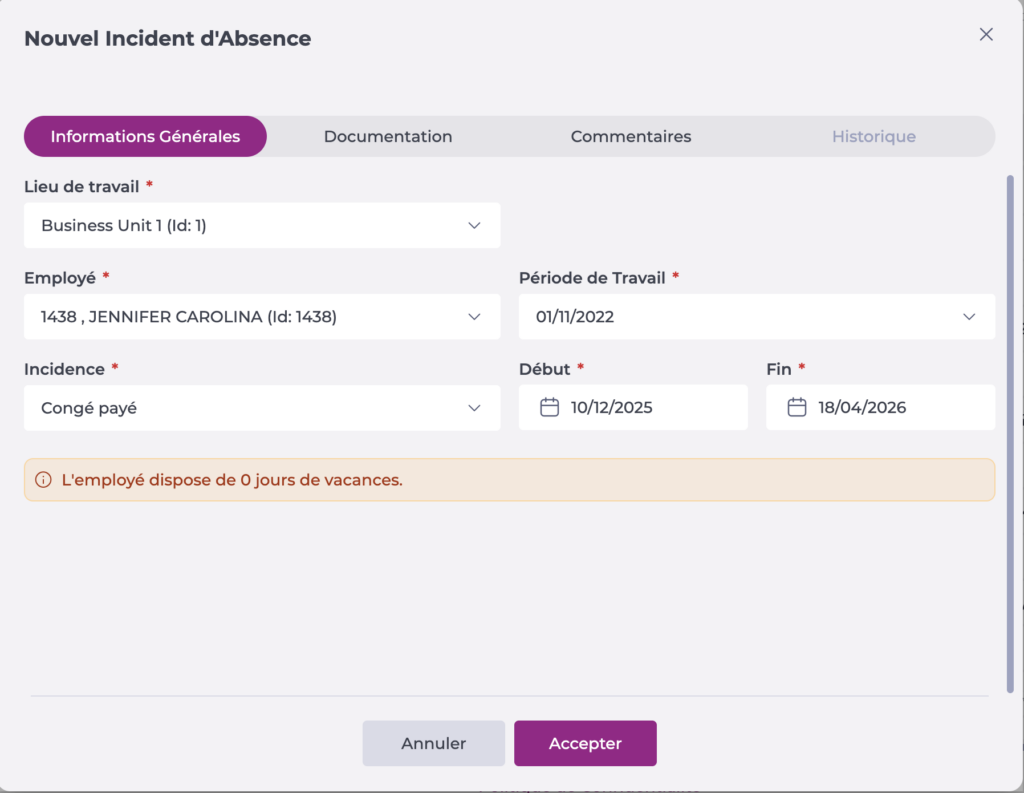 Veuillez noter que depuis cet écran, il est possible d'ajouter des congés ou des incidents à une date future ou passée. Cette possibilité est définie par les autorisations actives dans le rôle de l'utilisateur.