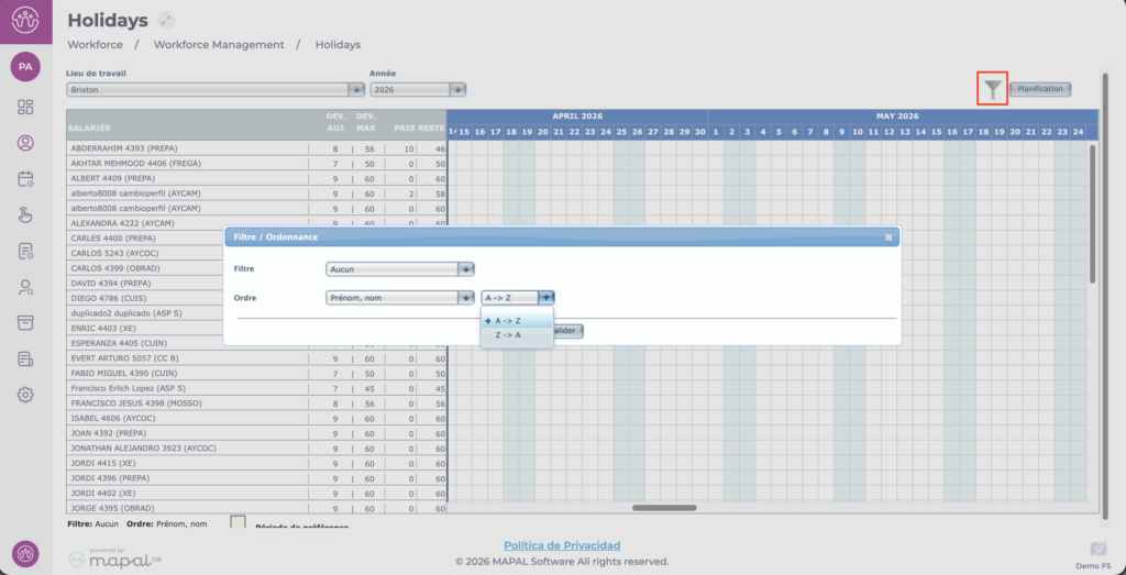 L'écran vous permet de filtrer ou de trier les employés pour n'afficher que ceux dont vous avez besoin.