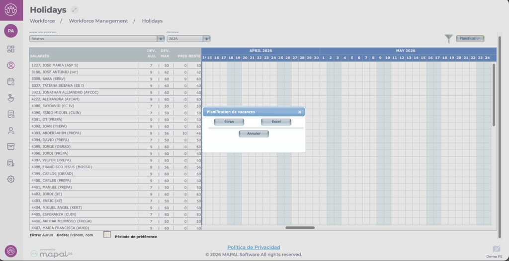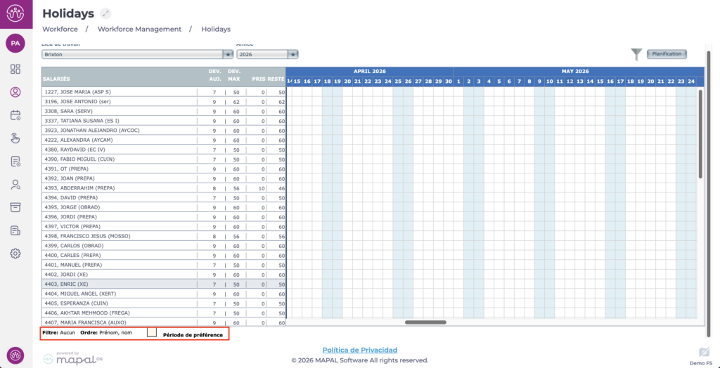 Les employés ont la possibilité de demander des périodes de préférence de congés depuis l'application Mapal One, à condition que leur profil ait été préalablement configuré.