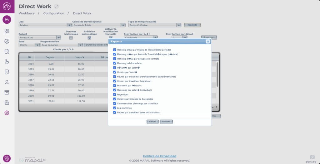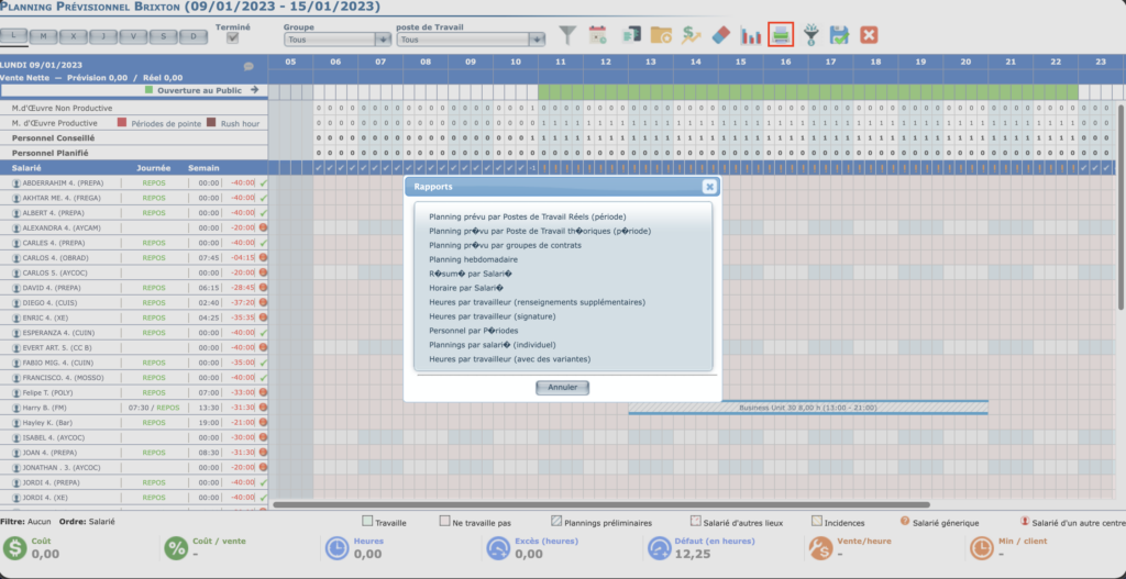 Une fois configurés, les rapports seront disponibles depuis Plannings hebdomadaires > Rapports.