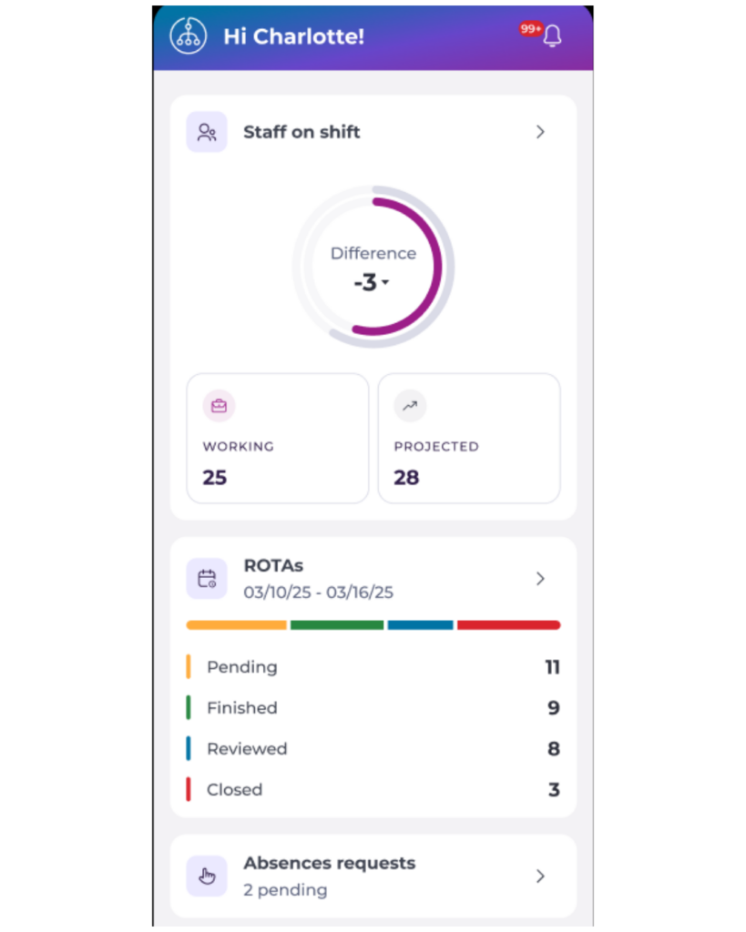 - Open ROTAs to see rota status and staffing for the day.