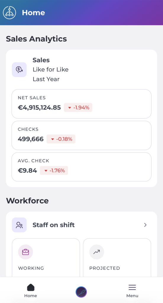 - Staff on Shift: Shows the number of staff currently working versus the projected headcount, and the difference between the two.