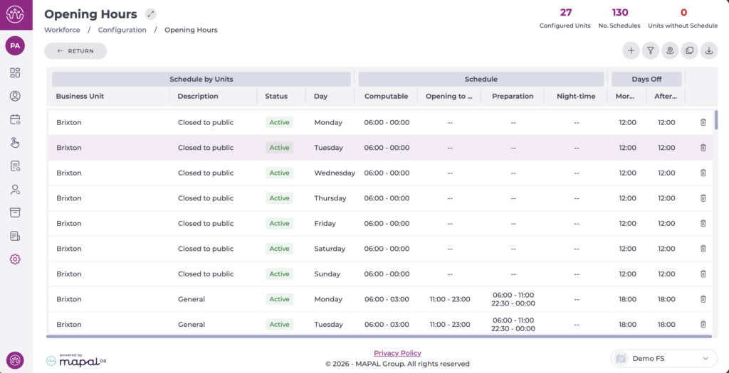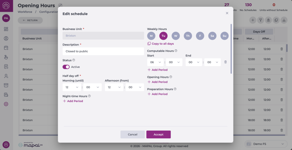 Note: Editing Opening Hours is recommended if there has been an error during the initial creation. Otherwise, for traceability purposes, it is better to create new schedules and assign them to the corresponding business units.