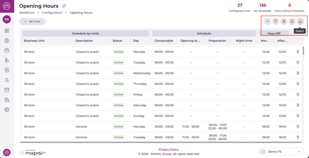 Additionally, you can use the Filter to narrow down the view of the business units - schedules displayed and Export the selection or the full list to Excel. Both options are located at the top of the screen.