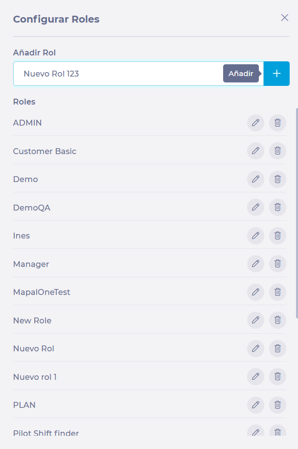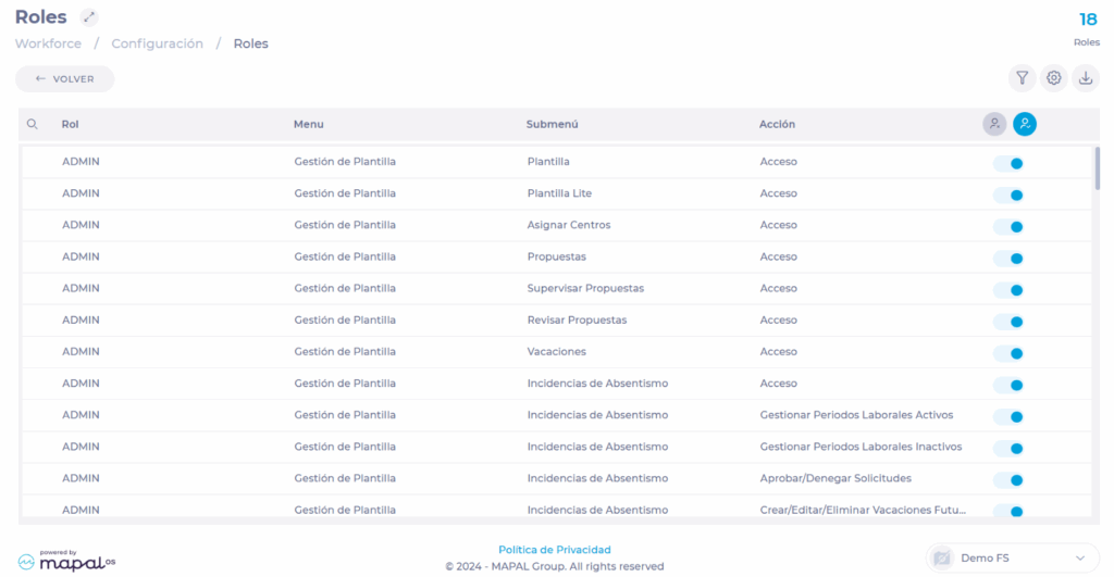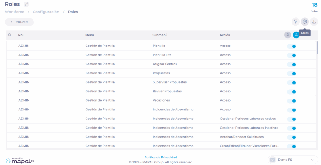 On the Roles screen, you will find a list where you can view each created role, the areas they can access (Menu and Submenu), and the permissions (Action) they may have for each. The switch at the end of the row indicates if the permission is active (blue switch) or inactive (grey switch).