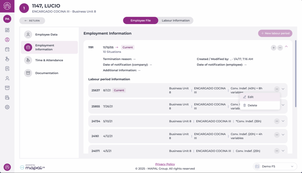 - In the box with the employee's Labor Period Information, select Edit to modify an ongoing period OR New to set up a new period.