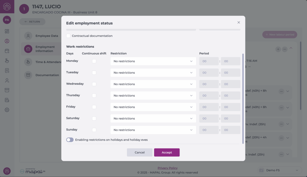- Set the work restrictions for each one of the weekdays. You can set restrictions based on specific working hours (Works from, Works up to), Specific Shifts, No restrictions, or Does not work.