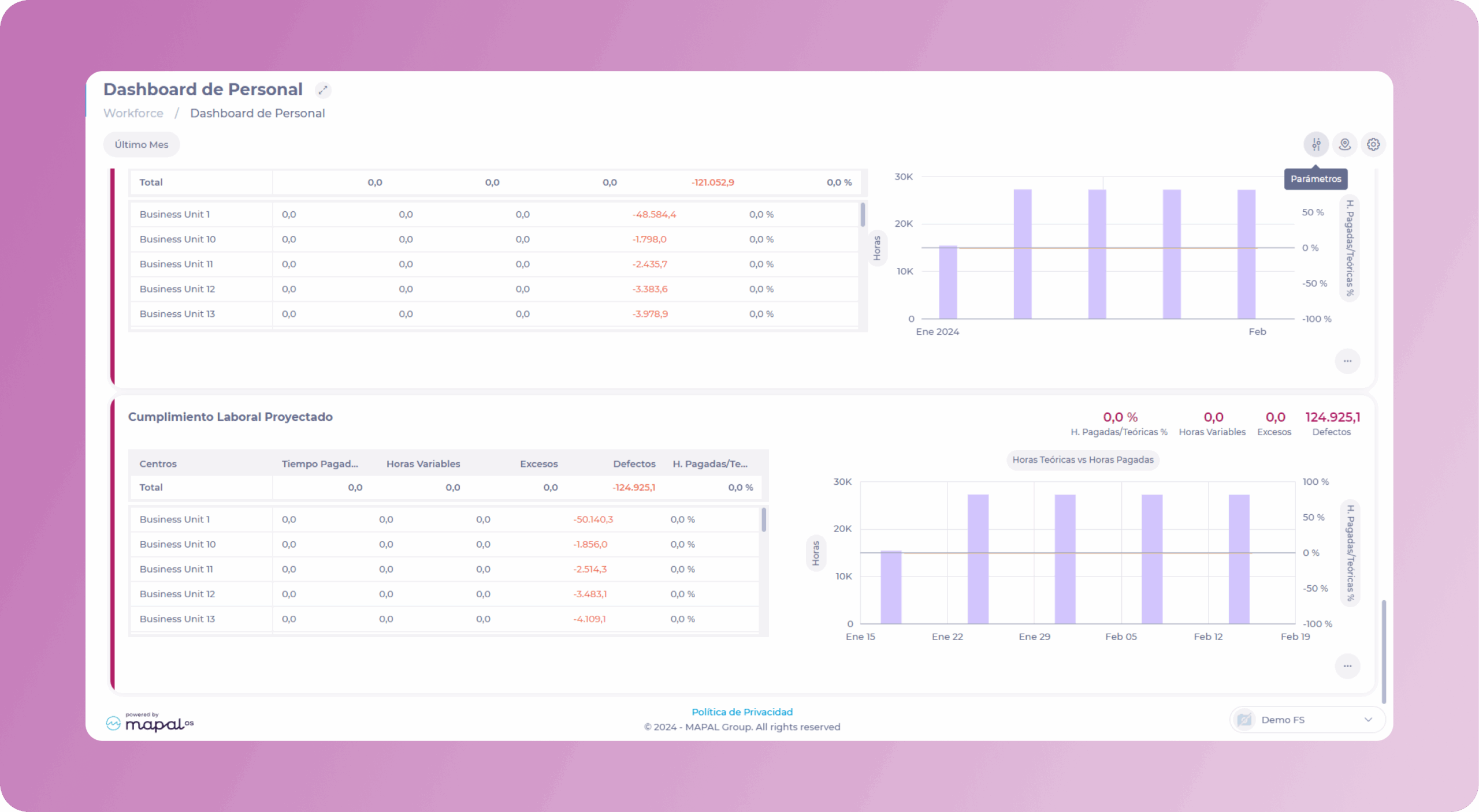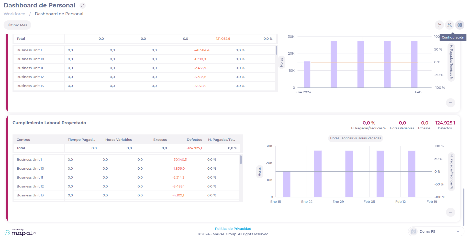 In this screen, you will be able to navigate through figures and graphs that will allow you to perform a detailed analysis of key personnel indicators.