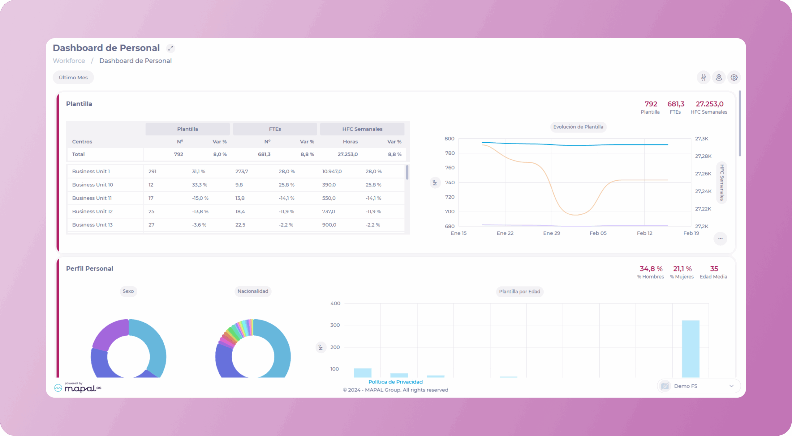 In this screen, you will be able to navigate through figures and graphs that will allow you to perform a detailed analysis of key personnel indicators.